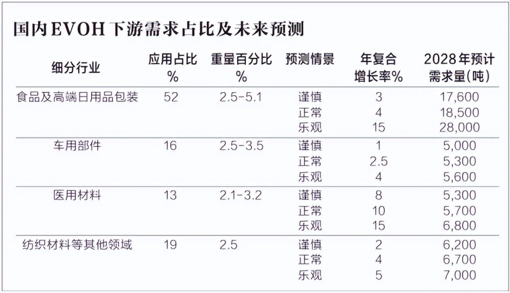 预计至2028年,全球EVOH树脂市场规模将达88.76亿元,年均复合增长率为3.86%。目前,国内EVOH年需求量约3万吨,主要应用领域有包装、车用部件、医用材料及纺织材料等。综合分析不同行业的增长情况及未来EVOH成本降低等因素,乐观预测,2028年国内EVOH需求量将达5万吨。在EVOH的使用端,需要具备较高的技术水平才能较好地发挥材料的加工性和阻隔性。